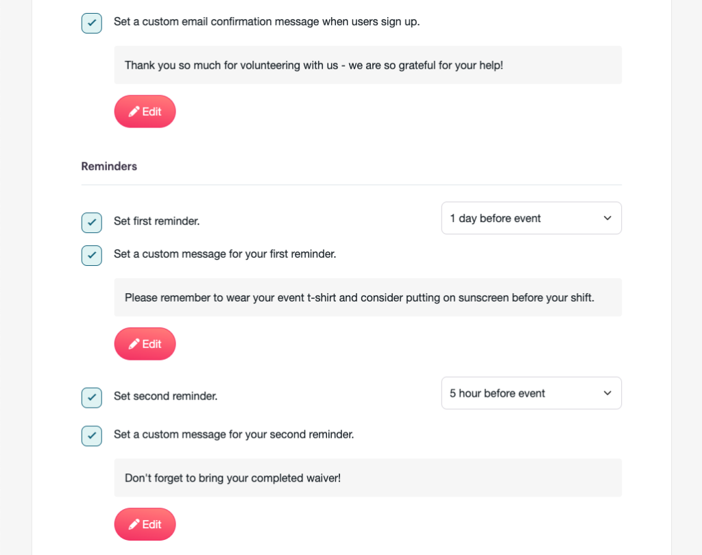 Custom confirmation and reminder email messaging may be added via your Event Settings