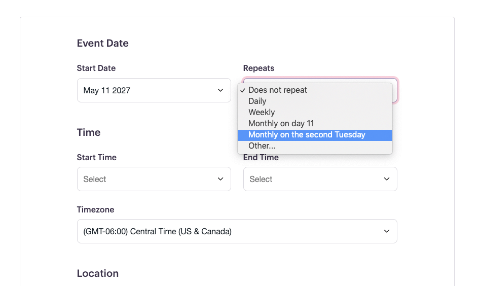 In addition to our current offerings, you can now have dates recur on a specific numerical day of the month (e.g. the 7th of month), or the 1st, 2nd, 3rd, 4th, or 5th day of the month (e.g. the 2nd Thursday of the month), or alternating weeks or months.