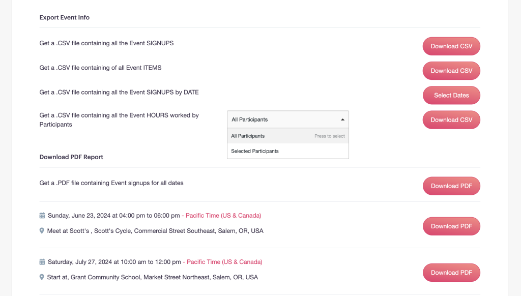 • CSV of Event Hours worked for all Participants or Selected Participants