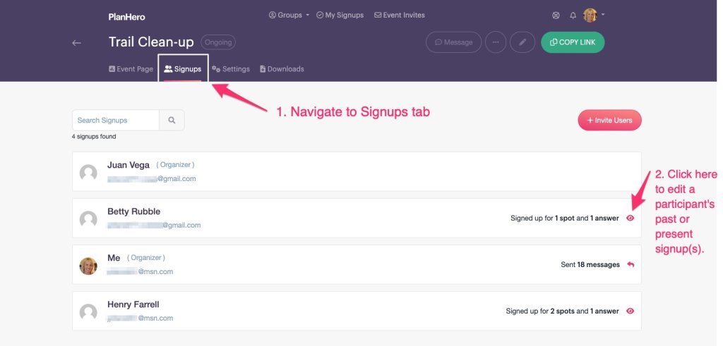To edit/delete/add a participant’s signup(s) for past dates, click on the SIGNUPS tab in your PlanHero dashboard. Then navigated to the desired participant’s name, click the “eyeball” to right of it, and start editing.