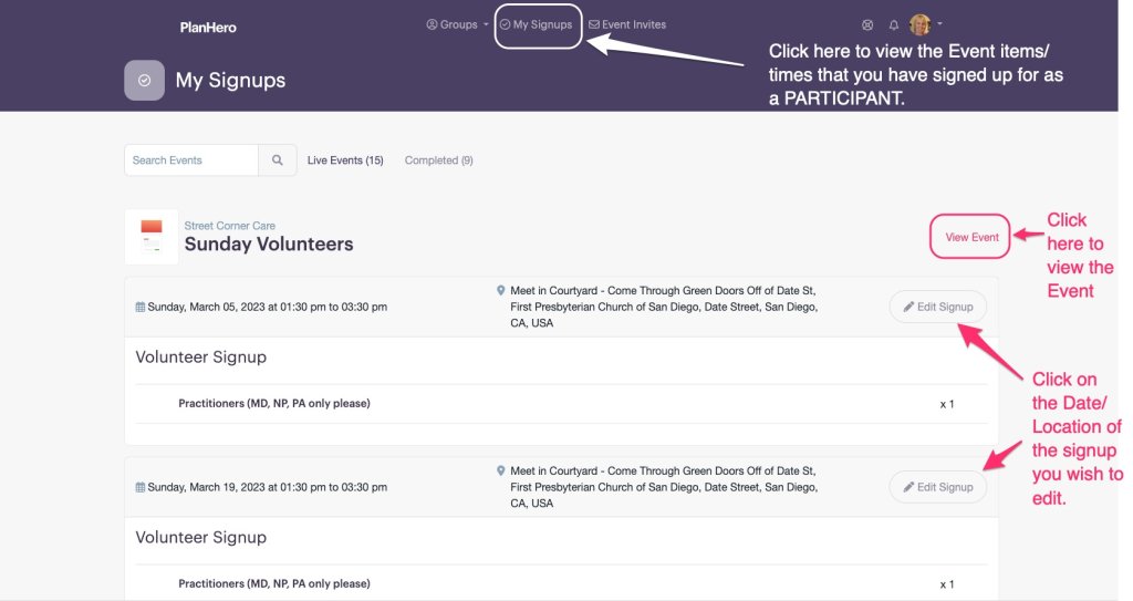 Once logged in, navigate to the My Signups tab. Here you will find all the Events for which you have signed up. If you have signed up for multiple spots on an Event, you will see them individually listed by Date and Location. You can search your signups by Event Title as well.