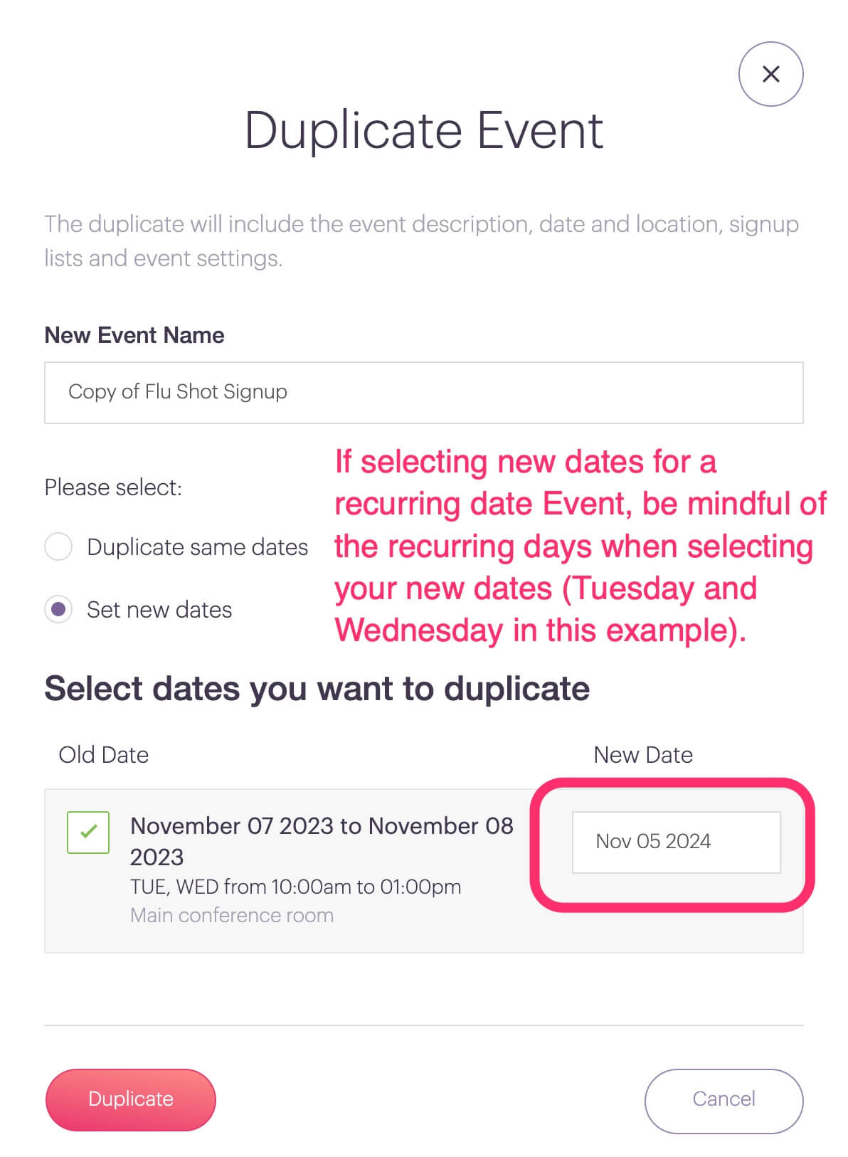 - If you are duplicating an event with recurring dates, make sure you select a new start date that coincides with the days that recur (e.g. If your event recurs on Tuesday and Wednesday, then pick a new start date that falls on a Tuesday)